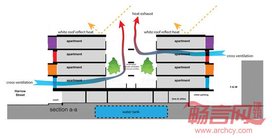 为了增加公寓住户在公共区域的舒适度,楼内公共活动区域被设计成天井,仿佛整栋公寓的“肺”一样——提供日照光线和自然通风,同时也可以种植绿色植物。