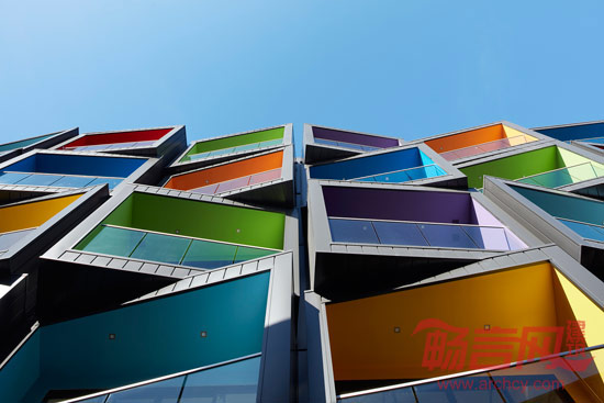 光谱公寓位于三面临街的地段,而这座公寓以同一种建筑语言巧妙处理了与三面街道的关系。呈条带状的建筑外形代表了博士山华人区的多样文化环境,这些“条带”在楼面板之上呈现几何变化,形成了高度铰接式的外立面。围绕阳台的颜色鲜艳的装饰带形成“条带”的末端,为公共空间增添一份活力。