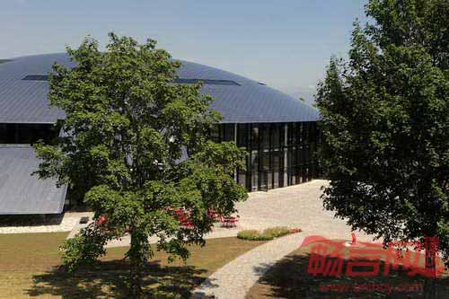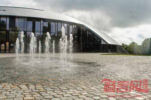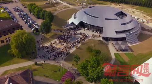 建筑具有较低的弧形穹顶,覆盖了不锈钢材料,与周边历史建筑构成反差。巨大的屋面设有矩形礼堂,周围是呈现出环形布局的配套设施。