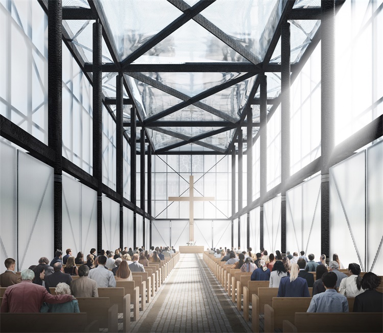 在四月的巴黎圣母院大火烧毁教堂屋顶后,Gensler晋思建筑事务所完成了一个临时宗教空间设计。坐落于教堂前的广场上,圣母院临时宗教场馆将用于850年历史的教堂修复期间,进行礼拜仪式,并用于游客和居民的集市活动。设计公司提交的方案回应了主教Patrick Chauvet以及巴黎市长的诉求,将复制原教堂大厅的尺寸,给人们熟悉感。教堂屋面将采用EFTEC轻型塑料膜,墙壁采用半透明聚碳酸酯板材。