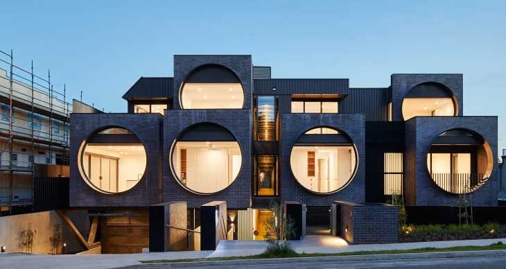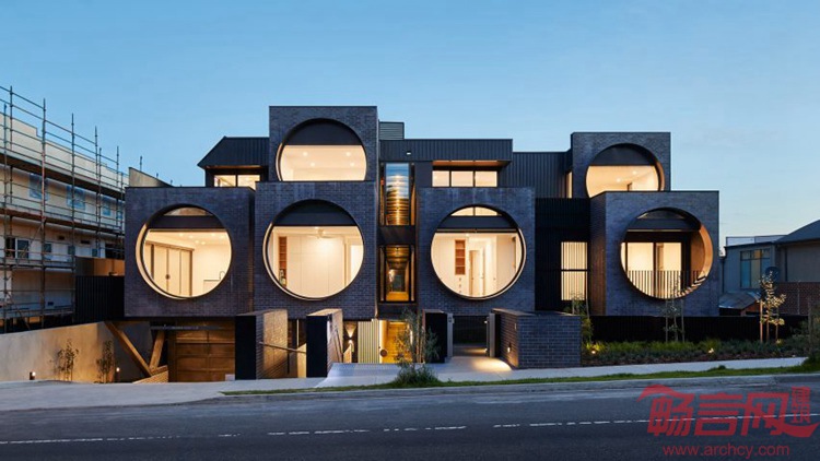 环形窗户占据了锯齿形砖砌外立面的主体,这座位于墨尔本郊区Ivanhoe East的公寓楼由澳洲BKK事务所设计。项目涵盖44套公寓,场地是一块陡峭的坡地,坐落在一个居民区内,距离城市中央商务区东北约十公里的位置。Cirqua公寓设有六个舷窗,灰色的砖砌墙面上的开窗,让墙面变得生动。