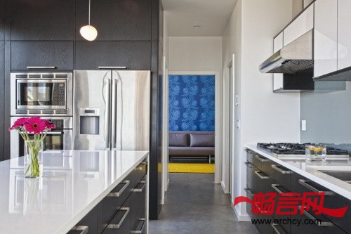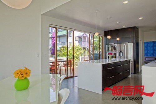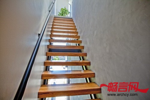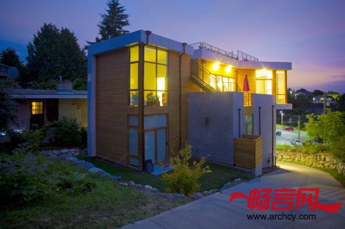 这个233平米的独户住宅位于西雅图的菲尼区(Phinney Ridge),它是Pb elemental architecture建筑事务所为一个年轻家庭设计的,住宅的地块很小。在这个只有186平米的地块上(因为整个地块的西南角还有一个入口坡道会占地)建造一个住宅是很有挑战性的,由于这个入口坡道的存在,让建筑的底座占用了大部分的庭院区域,所以,要想拥有室外区域,就得从建筑上面入手。出于这个考虑,建筑师们将楼层规划反过来了 —— 让起居室位于三楼,这样住宅的主要空间就直接与户外区域相连,并拥有良好的光线和视觉效果。房屋的主人精心的挑选了家具和墙面材料,这让房子看起来更加的温暖,仿佛欢迎客人到来一样。为了让住宅与街道在视觉上连接到一起,设计师为楼梯设计了玻璃外墙,这样人们在上下楼的时候就可以看到外面的活动。顶层朝西侧开放,这里有一个阳台和一个通往屋顶平台的室外楼梯,从屋顶平台可以看到博拉德公司大楼和普吉特海湾。