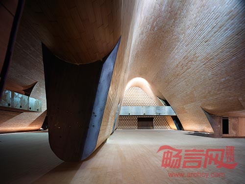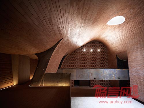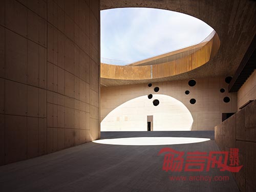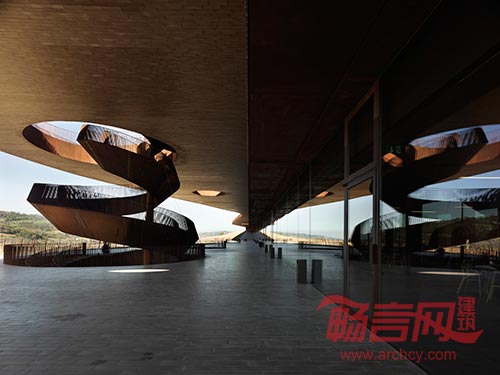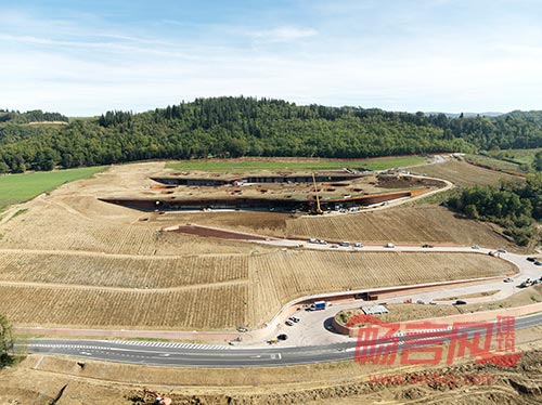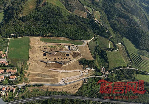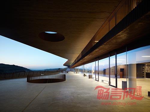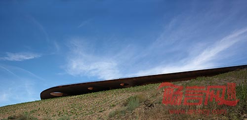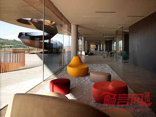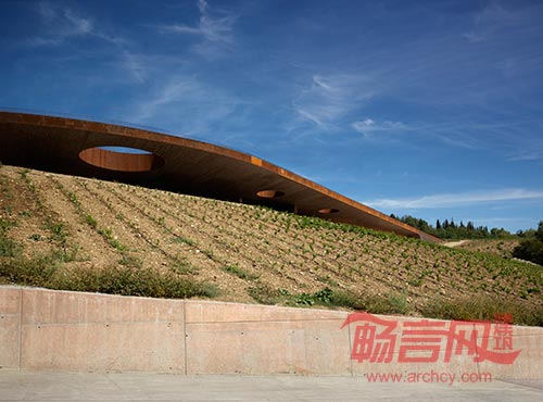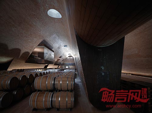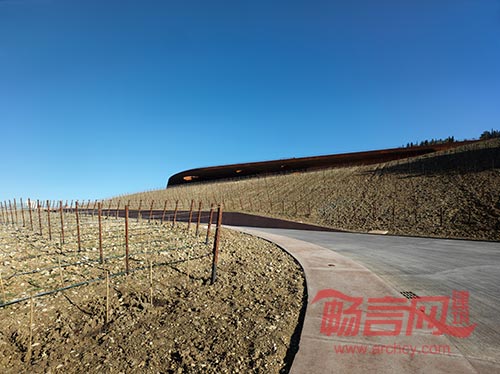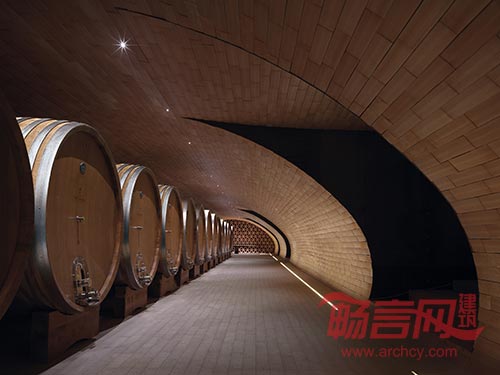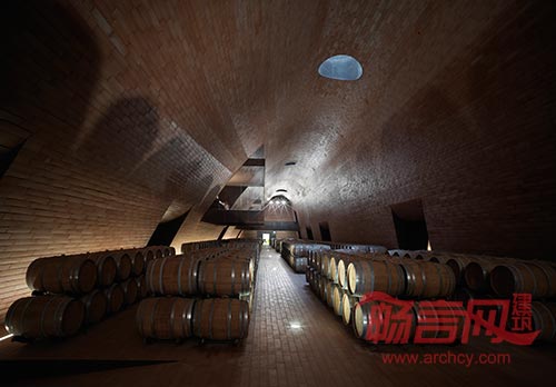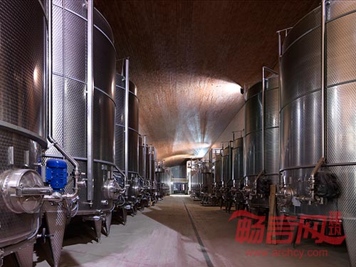 Antinori酿酒场, 是自然风光和传统酿酒工艺的完美组合,工作流程为地上采摘、地下酿酒,建筑形态带有浓郁的意大利传统文化气息与耕地风貌的特色。整个酒场建造在地下一个半球形空间里,从外观看没有房顶,没有墙壁,没有公路也没有停车场。建筑试图在寻求自然和人造的平衡点。