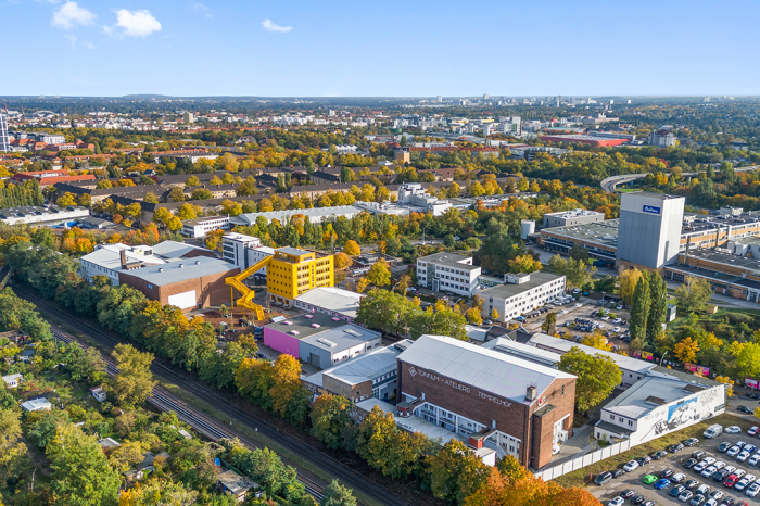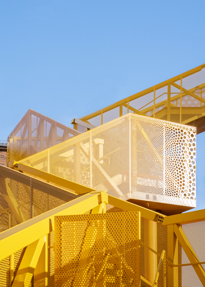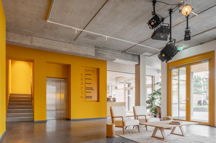 改造设计最明显的标志是建筑的颜色。原本是纯白色的建筑,现在变成了亮黄色,吸引远近的目光。一旦游客进入园区,他们会看到一个明确的标志:从园区中央广场处,一个曲折的黄色楼梯直通“Haus 1”的屋顶,楼梯平台处点缀着座位和观景台,勾勒出滕珀尔霍夫机场公园及柏林天际线的景色。