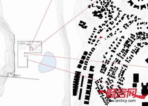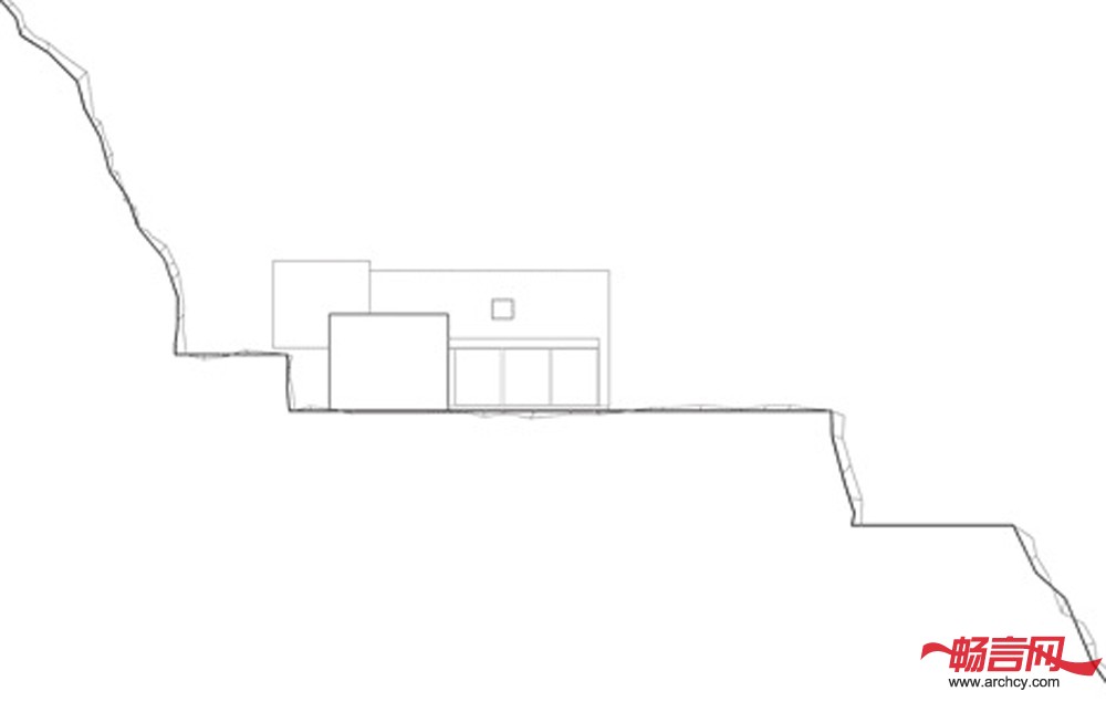 住宅的一层呈L形,它紧挨着岩石侧面而建,而二楼则从深入到峭壁的空间里面去。
