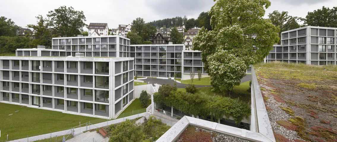 卢塞恩学生公寓由Durisch + Nolli Architetti建筑事务所设计。公共用途场地位于住宅和商业区域之间,邻近主干道。住宅区设立了若干小面积的统一住房和大面积绿地。项目主要任务是创造280套学生公寓,满足当代学生宿舍标准具体要求。模块化建筑垂直和水平设计迎合地形条件,建筑体量适当地调整,建筑高度与周边建筑高度相互和谐。建筑尺寸与场地现有住宅相符,基本尺寸是12×12米,如同多米诺骨牌排列。每间宿舍面积13平米。宿舍楼设有绿化屋顶,与花园达到融合。