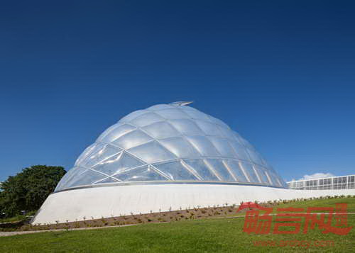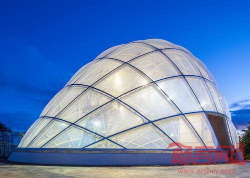 丹麦C F Moller建筑事务所设计了奥胡思的一个穹顶热带温室。温室的外立面是半透明塑料枕状物,充气后可以改变内部的温度和光线。设计师同FormT膜结构制造商共同设计了奥胡思植物园内的聚氟乙烯材料温室。该材料赋予建筑节能的围护结构,包裹了18米高的温室。通过升降枕状物内部的气压,建筑内的光线和温度可得到调节,同时外立面的透明度也随之变化。
