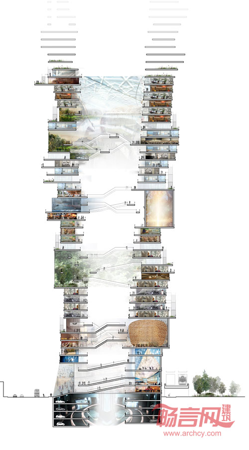 这个垂直城市由多种个性广场组成,为这座高楼创造高的人流量。从最公共的空间到最私密的空间,这个区域拥有建筑的壮观视角。
