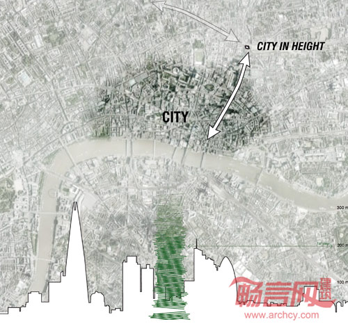 城市高度往往是摩天大楼的设计备选。我们的设计不是硬生地叠加楼层,而是想象两个无尽的坡道连续循环并从地面缓慢升空。现在伦敦的街道可以水平和垂直的扩展。