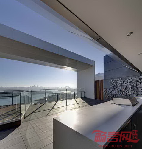 项目具有相当大的环境反差,面向悉尼港的东北侧条件优越,反之,西南面面临噪音、私密性和环境方面的诸多挑战。为了应对这些问题,建筑采用扇形平面,并使用了各不相同的立面。