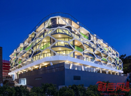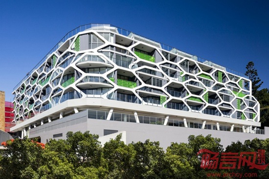 TONY OWEN建筑事务所完成了位于澳大利亚悉尼郊区的Alpha Lewisham住宅楼设计。设计灵感来自自然界中的蜂巢结构,基于模块化的住宅楼涵盖70套公寓。项目成为Mcgill总体规划的基石,这一规划也由TONY OWEN建筑事务所完成。六边形外立面营造了环境屏障,可控制进入光线和视野。建筑共有七层,室内区域包含公寓、多层公共区域、零售商业空间。一至五层涵盖了一室户和两室户公寓,六层和七层包含复式的空中住宅,提供俯瞰城市和周边公园的广阔视野。