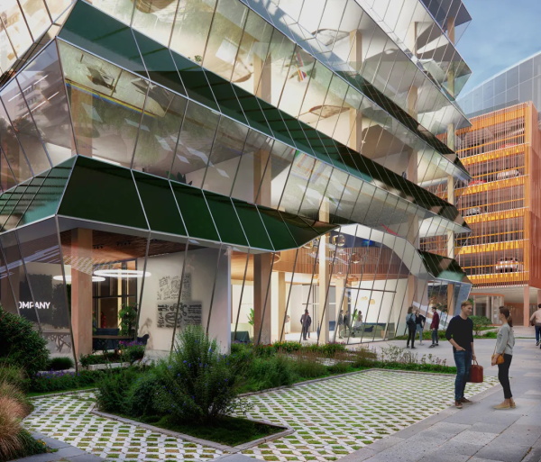 首期建设包含园区中的多栋核心建筑,将形成未来园区的中心区域,从圆形西侧边缘延伸至通讯中心与餐厅建筑,最终在园区中心点形成公共广场。首期建设除通讯中心与餐厅外,还包括交通枢纽、初创与创新中心、大型“生活实验室”(living lab),以及一座十层办公楼。