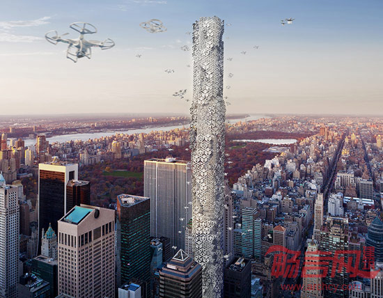 设计师Hadeel Ayed Mohammad, Yifeng Zhao and Chengda Zhu提出了一座位于纽约曼哈顿中心的摩天大楼设计方案,该大楼将用作无人机控制站,可用来停放无人机和为无人机充电。