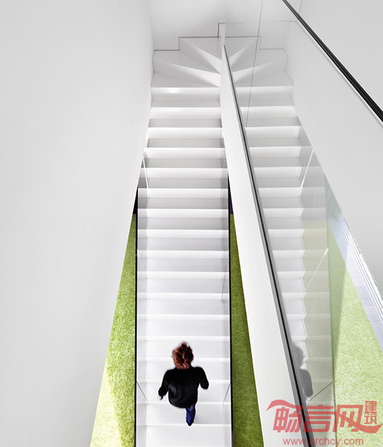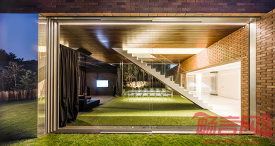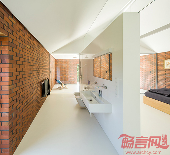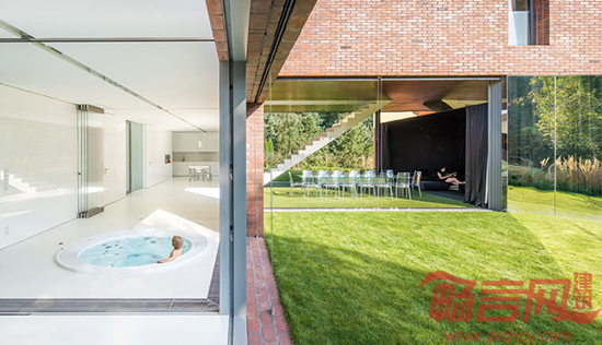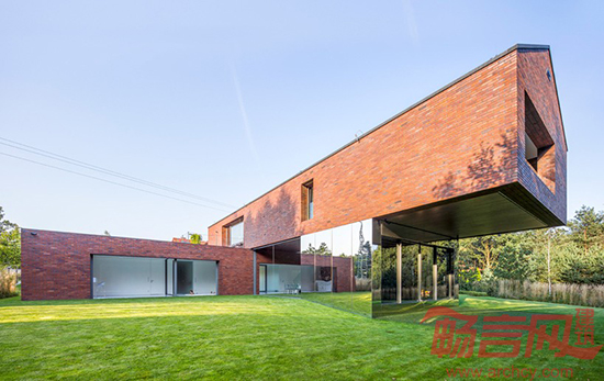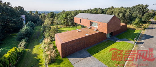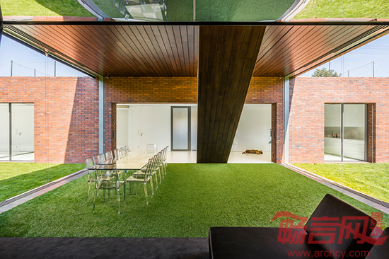 通过使用玻璃隔墙和人造草皮,设计师将大厅妆扮成了一个室内花园。此外,房子的构造和选材也符合当地的传统。山形墙和红砖材料是西里西亚工人居民区的特点。房子的地面层与旁边的道路平行,因此可以将房后的花园与道路隔离开来;而楼上一层则来了一个90度转弯,横空骑在花园上方。