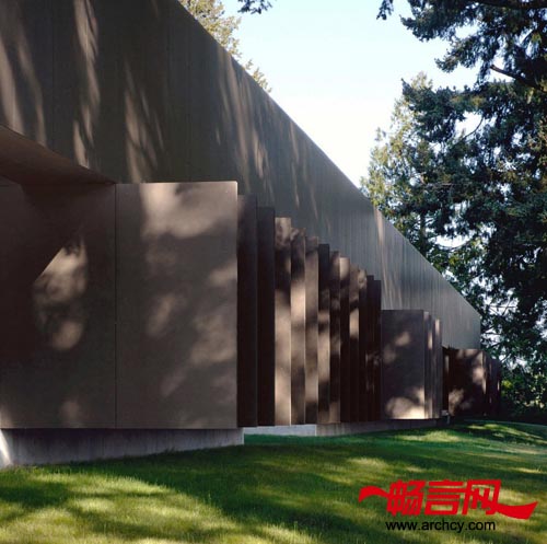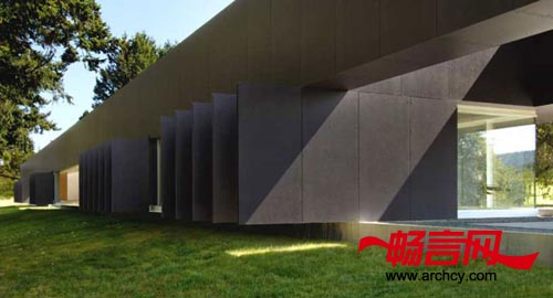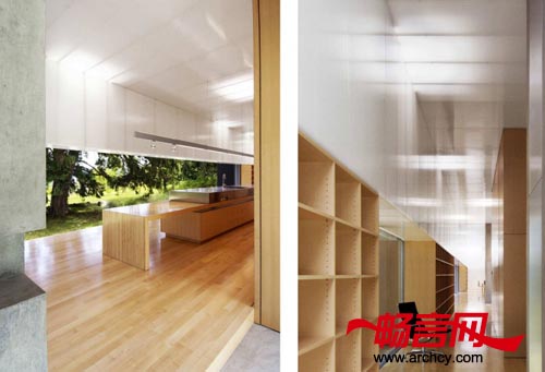 新住宅被一条通往主室和客室的通风廊分开。它的外墙由炭黑色的水泥板砌成,这样,从远处看,住宅便与茂密的杉木林融为一体,让你找不见它。与住宅外部相比,由半透明的亚克力板装饰的内部色调便显得十分明亮。在白天,40多扇天窗可以为住宅内部提供充足的光线;到了夜晚,天窗上的荧光灯将室内照得一片明亮。