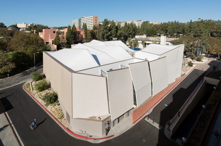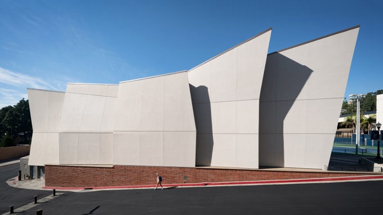 加州Kevin Daly事务所设计了UCLA大学篮球馆。该项目名为Mo Ostin篮球中心,供大学男女篮球队共同使用,两支球队都排名全美前五位。建筑设有翅状的墙板机构和流畅的屋面线条,设有多个天窗。项目总面积达37万平米,采用了斜面墙板和波浪形、砂岩状外立面。坐落在角落位置,该训练中心采用薄层玻纤增强混凝土定制板材,采用场外预制,营造了温暖的流畅形态。