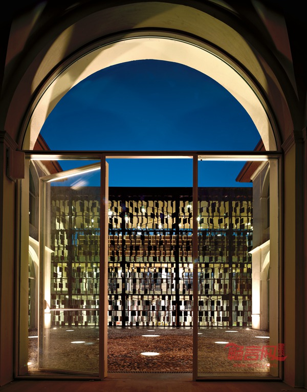 这层特殊的“幕墙”结构保护了里面的玻璃体量,同时成为内外空间的界限.。外立面的这种特征在各个面上均得以表现,在每块陶土砖的开合转动之间,创造出一种连续的韵律。事实上,陶土材料的运用在突显传统建造技术的同时,,最终的效果也极富现代感,建筑可以被从不同角度阅读,其特殊的空间语言通过光影的变化,建造的质感,结构的统一以及材料运用与色彩共同作用来表达。新图书馆的入口位于意大利广场,也就是原来学校的主要入口,参观者首先进入一个接待区以及信息服务的区域,此区域在现状的基础上凸现出宽敞与高雅的内部装饰风格,并反映出该图书馆的公用功能。