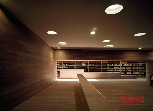 由前台区域进入走廊,较好的采光角度,并可以从此去往与之相连的图书馆内的不同功能的房间。该区域还呈现出一种连续性的展示效果,读者可以通过咨询空间进入各阅览室。位于地下宽敞的大厅备有电脑以便读者进行查阅,并与新的体量相连接,此新的体量内具有多条通道可通往阅览室。旧有建筑的一层和二层主要作为儿童阅览室,信息查询室,报刊阅览室以及多功能大厅,同时新的翼状建筑的统一结构主要功能是服务于图书存放以及阅览室。 超过9米的书柜的结构为特点,这个新的体量成为了以书本为建造设计特点的知识财富的象征;并且通过两个结构上突出的以汲取知识为主要功能并且可以俯瞰外立面的读书休闲区域来保证了新的建筑可接近的三个层次。