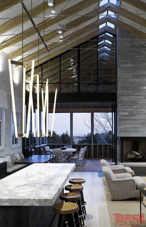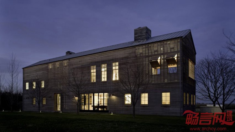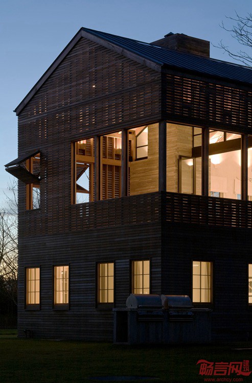 项目位于纽约州Hamptons,由Leroy Street工作室设计,带有木质的遮阳窗,使建筑的外观非常柔和,也在夜间有种薄纱般的半透明感。项目坐落于长岛南岸海滨的Wainscott,百叶窗住宅旨在回应其所在的地理位置。木质的框架,矩形的造型,单面坡屋面,均参考该地区曾经普遍存在的谷仓建筑。住所外立面和开窗也符合文脉语境。
