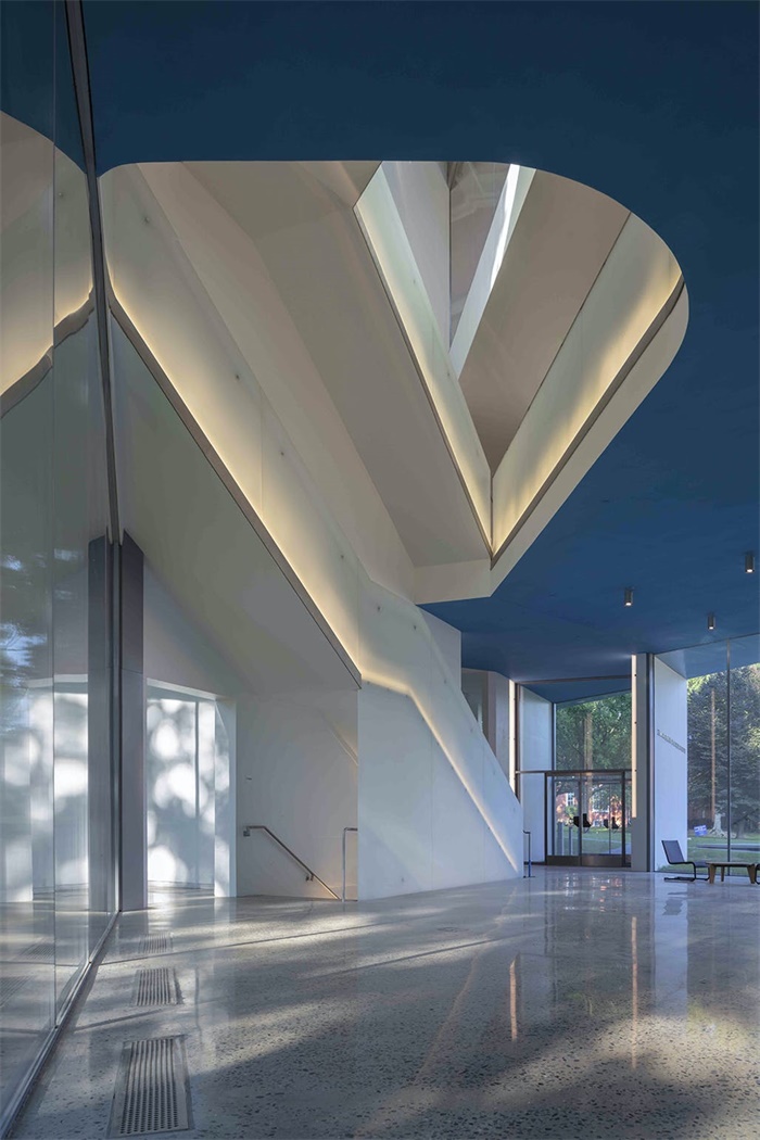 设计团队以周围200年树龄的树木为模板进行了几何渲染。设计师表示,”我们把树木几何结构看作新艺术建筑塑形的方式。新展馆并未呼应现有的长方形艺术建筑,而是根据校园中的大树做了艺术生成。”