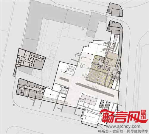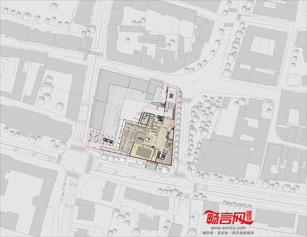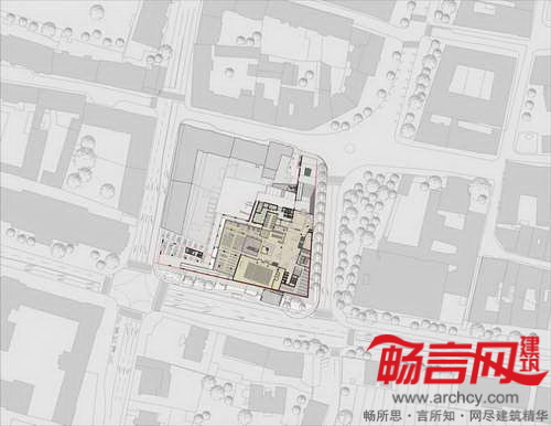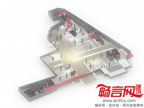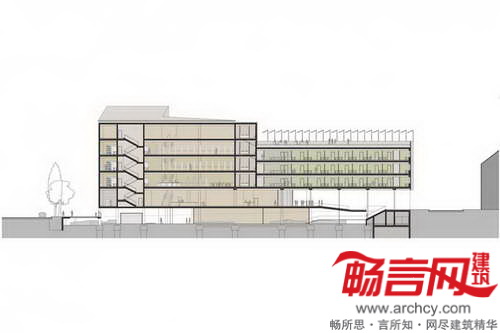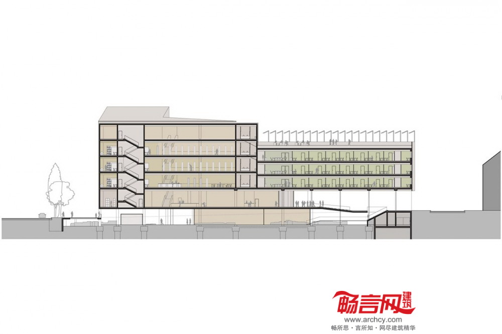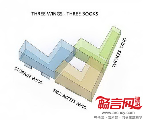 图书馆项目为“翼”结构,建筑低层是图书馆区,朝向东北边的法国革命广场;公共入口翼构成了Emonska和Zoisova街道拐角,协调了斯洛文尼亚Zoisova十字路口繁忙交通和革命广场的喧嚣活力的平衡关系。