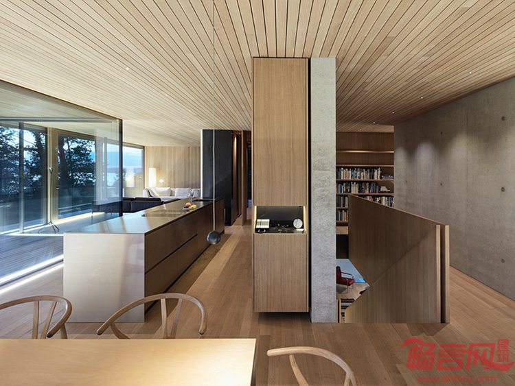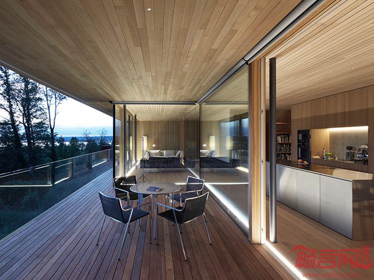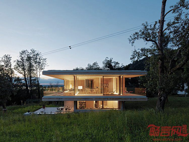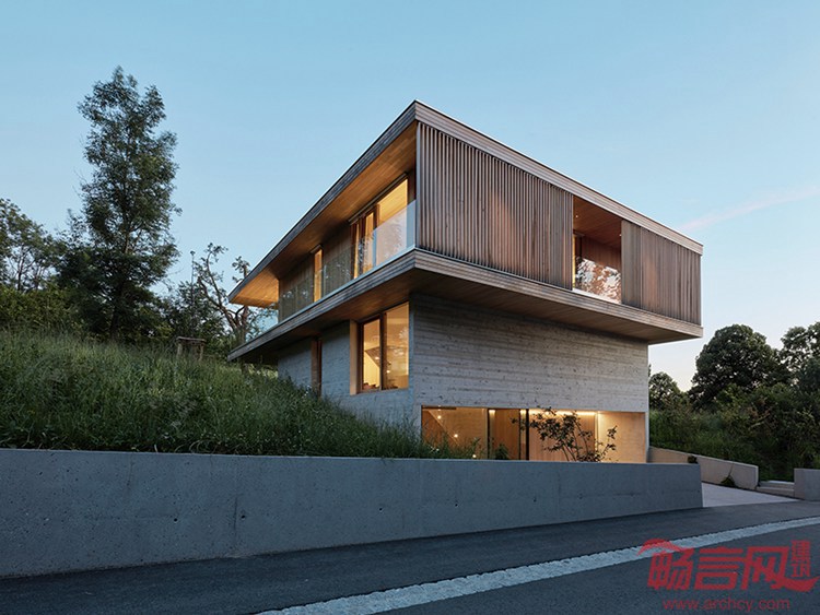 Dietrich Untertrifaller设计了奥地利D Bregenz住宅。项目位于山脚的项目俯瞰Bregenz,业主是一个四口之家。设计顺应其文脉,营造出显眼的外形,并自然融入周边环境。这一理念反映在三层空间的几何设计上。建筑结构注重细部处理,符合奥地利该地区闻名的手工工艺传统。建筑带有开放式布局,提供向乡村湖光山色敞开、一览无余的视野。三层区域分工明确。超大尺寸的平屋面和二层为下方露台提供遮蔽。入口和设备区设在一层,二层为主卧、客卧和儿童房等卧室空间。三层是餐厅、厨房。室内应用了木质饰面,方便家人团聚和朋友来访使用。三层露台围绕了整个住宅外围。