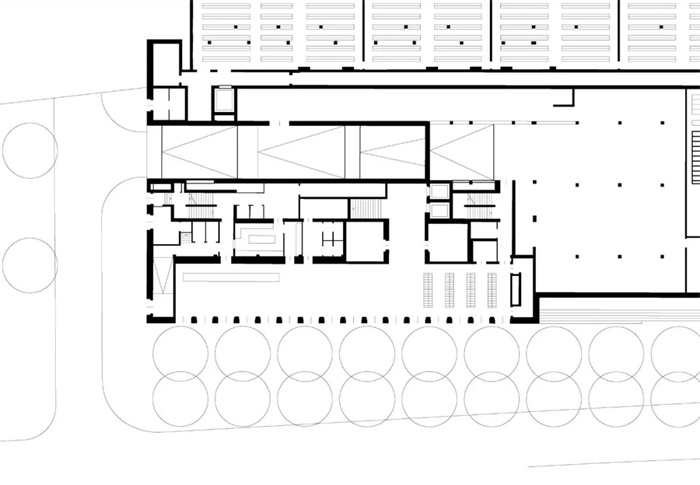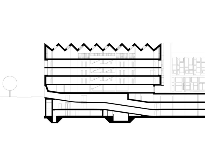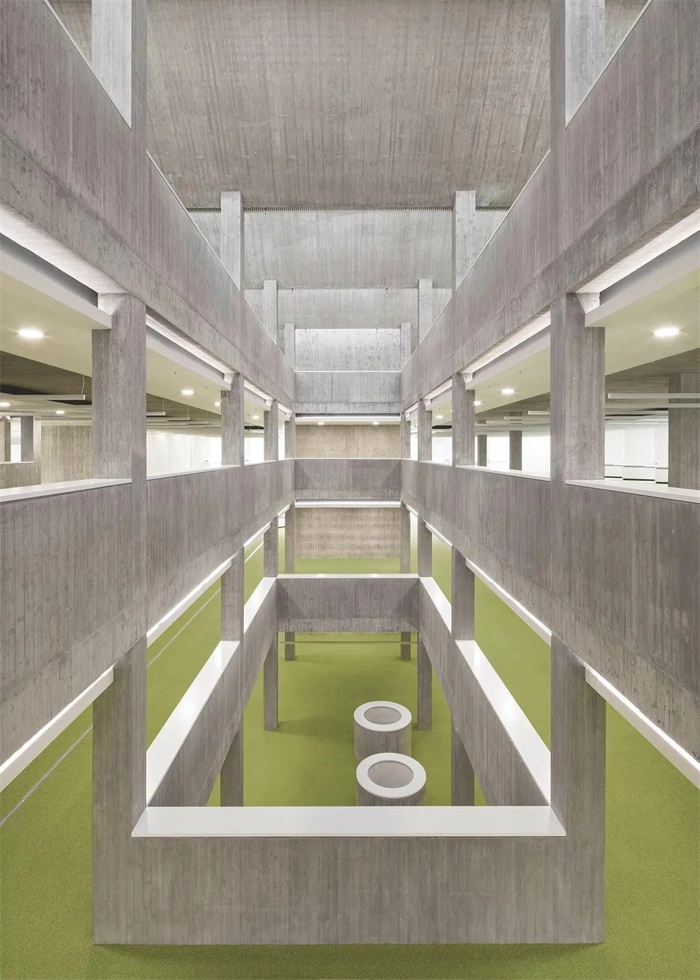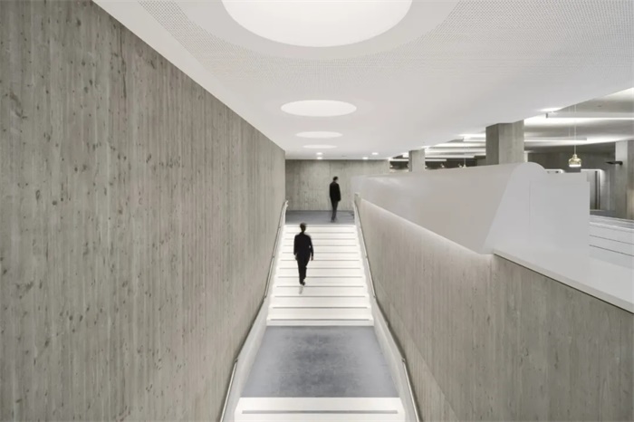 新建筑裸露的现浇混凝土与旧建筑相呼应。在立面上,白色水泥和二氧化钛颜料使混凝土达到浅色效果。混凝土立面的外表面是一层现浇混凝土,内为隔热层与混凝土承重墙。模板为手工制作的粗锯板。