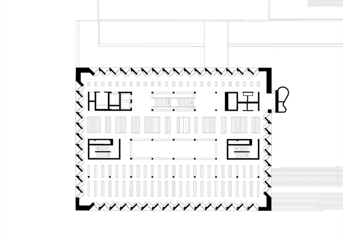 新楼填充了老馆所在地块的剩余空间。建筑粗略地参考了威廉宫的屋脊高度,与老馆分开,使街道能够贯通至建筑群的下方。建设新地下停车场使以前的入口处可形成一个宽敞的广场,广场的另一侧是国家档案馆。从城市角度看,旧阅读室的立方体积现在位于新广场的中央。多级踏步建立了建筑与新人行道之间的连接。