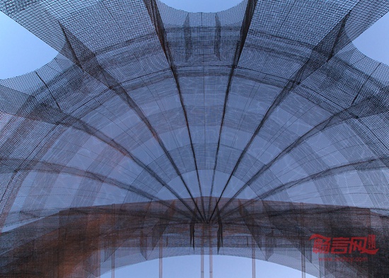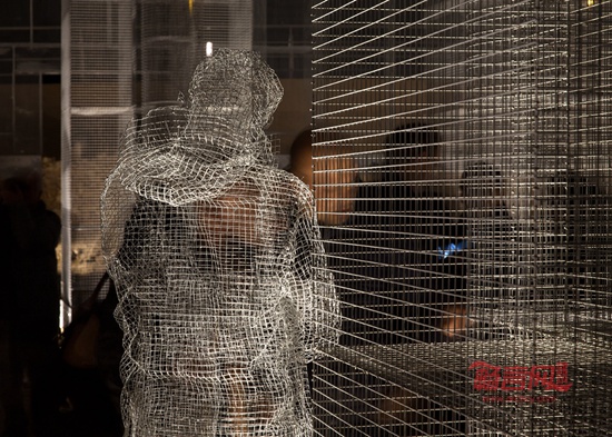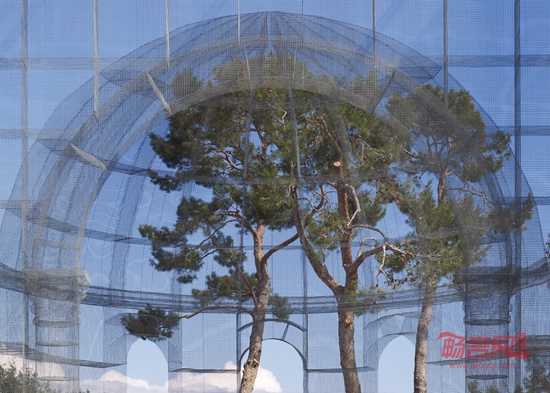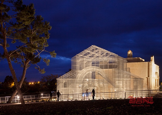大量的铁丝网重现了全尺寸的教堂结构,包括罗马式的穹顶、弧形窗户和柱子。在夜间,聚光灯将整个教堂照亮。