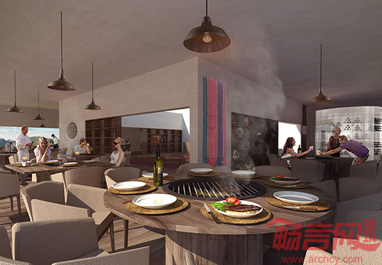 餐厅入口处,映入眼帘的只有简单的混凝土结构、广阔的天空和波光粼粼的水池。顺着台阶往下走,进入就餐区域,这里摆放着圆形的餐桌。餐桌围成的中央区域铺设着玻璃地板,从这里可以看到山谷底部,给客人们带来一种完全浸入当地风情和地貌的感觉。