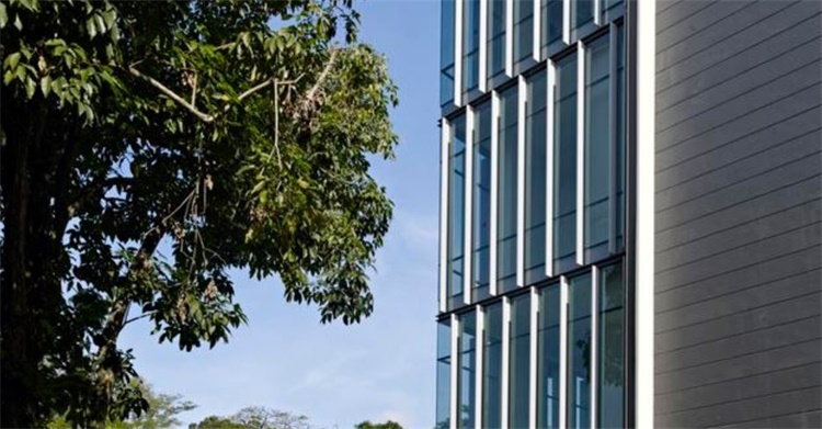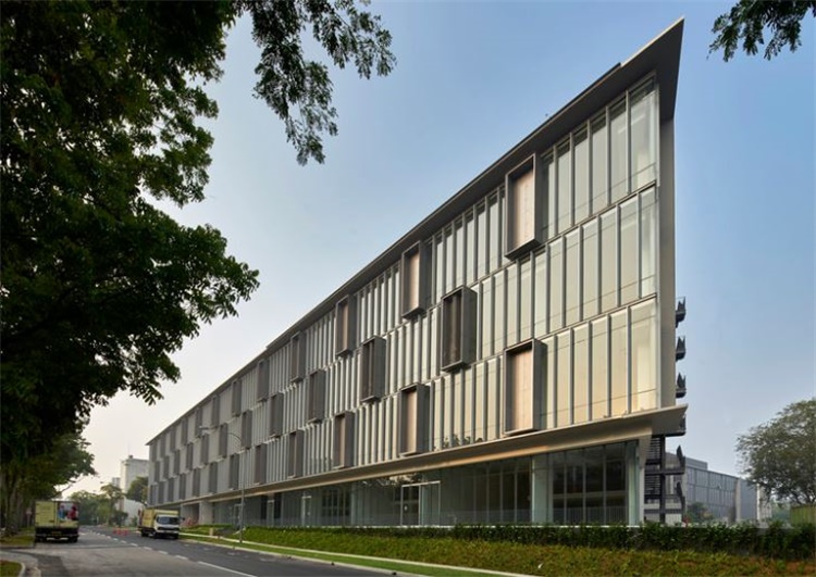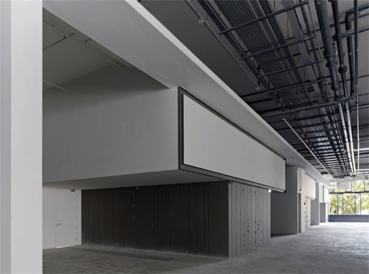 工厂的主立面被表达为一层平铺的竖向铝制遮光板,在玻璃幕墙表面上产生了连续的节奏感。这种由玻璃和竖向遮光板组成的有节奏背景不时地被伸出的阳台点缀和打破,形成引人注目的视觉变化。一楼的店面单位后缩,透明感的全玻璃加上后竖框的设计,让上方楼层的体量仿佛飘浮在空中的。建筑的屋顶覆盖着一个深深的突出的屋檐,形成了一个尖锐的轮廓。