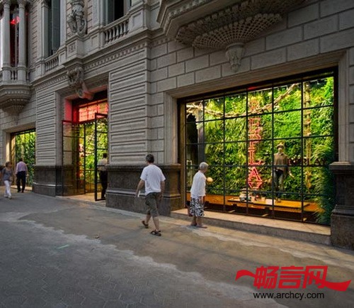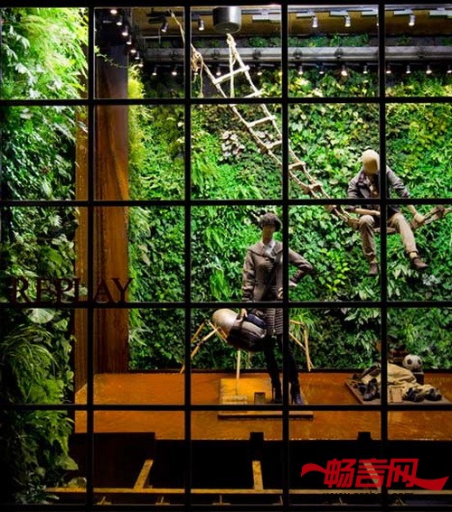 Replay(服装店)格拉西亚大街店的一大特色就是,它的展窗妆扮了蕨类植物和秋海棠,看起来绿意盎然,十分清雅。