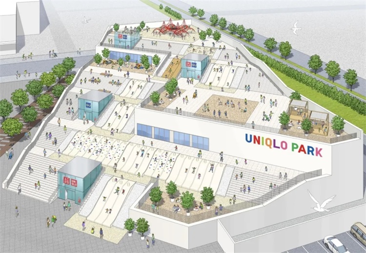 整个 UNIQLO PARK 的建筑从远处看去就像是一个大型阶梯,独特的建筑结构带有倾斜的屋顶。所有人都可以在屋顶的公园游玩、休息,享受乐趣