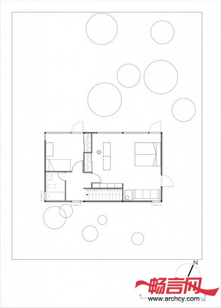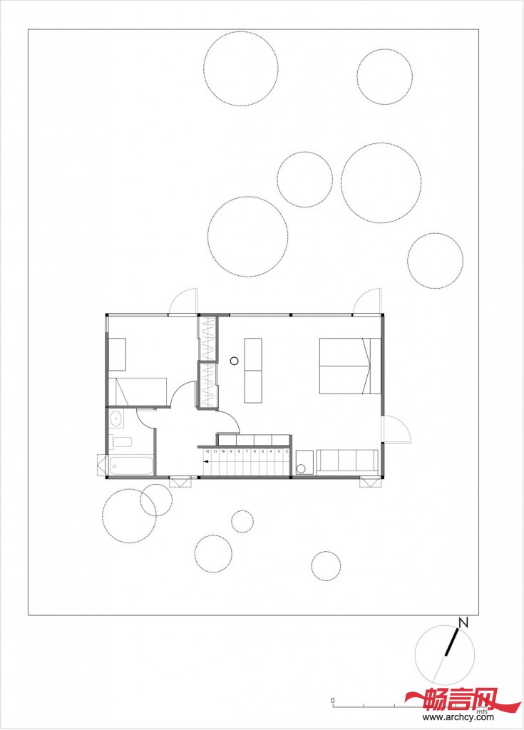 这所房屋共建有两层,是一个长9米,宽6米,高6米的长方体。在日本人看来,长方形是唯一一个不会违背自然的元素,是一个干净、会自然消失的元素。方形的建筑的简洁可以使其最少的占用森林空间,最大程度的保留建筑内部的热量,以抵御冬天严寒的侵袭。为了更加容易地给这两层空间供暖,卧室的北面安装了大型窗户,它可以采用透过玻璃储存的能量和热量。到了夏天,榆树的枝叶便可以控制自然光,使建筑躲避烈日的照射,凉爽宜人。