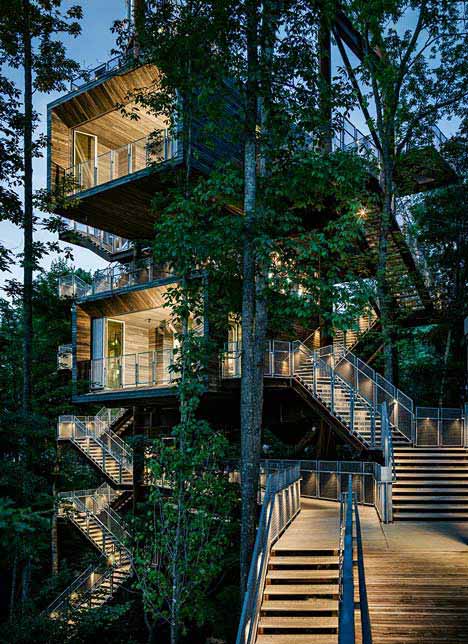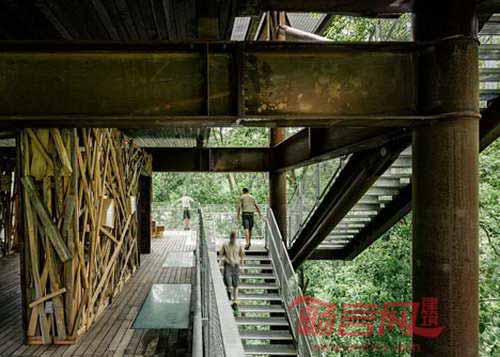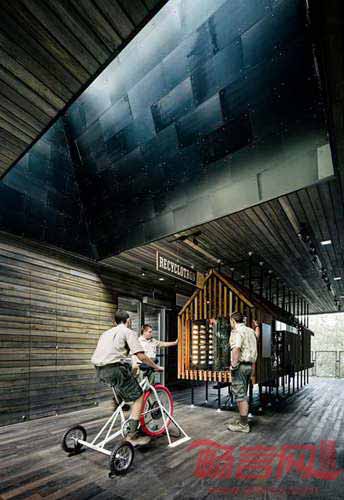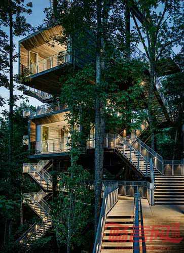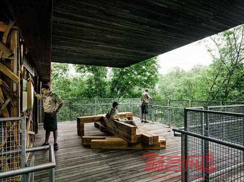 Mithun事务所设计了位于一处童子军活动树屋,同时为西弗吉尼亚公园游客提供展览中心功能。可持续树屋位于Summit Bechtel童子军保护区,占地4000公顷,成为为期两周的童子军训练营的永久场地,这一活动每隔四年举办一次,面向5万名童子军志愿者。项目采用了半成品材料,这些材料在环境中自然老化,无需特别维护,包括耐候钢、回收橡木和当地生长的洋槐,后者用来支撑栏杆和楼板。项目采用高效的可持续性措施,建筑能产生自身所需的热能、电力和水。