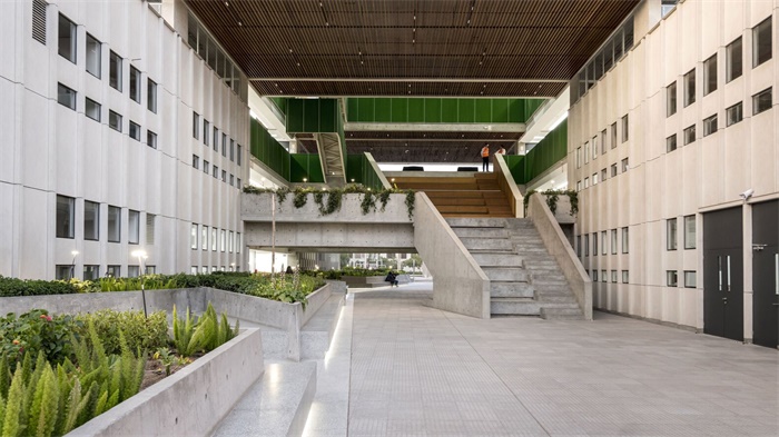 这种共享空间的设计在校园的入口处就有所体现,设计团队在入口让出17%的地块作为公共区域,通过设置遮荫的树木、长椅和集会空间来改善社区的空间质量。这一做法反映了设计团队在改善城市环境方面的考量。