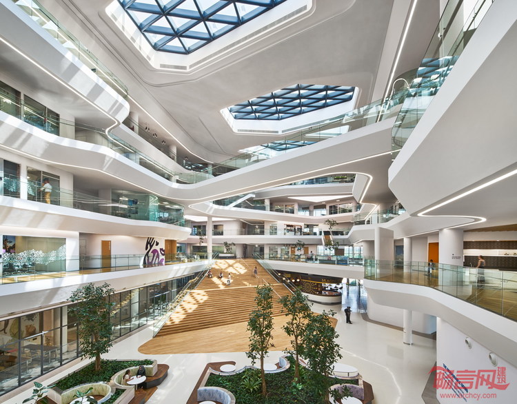 设计借助立面上的凹槽形成室内和室外的绿植空间。建筑的四座翼楼由处于凹位的广场相连。室外景观平台及屋顶平台同时可供员工及访客进行休闲放松。