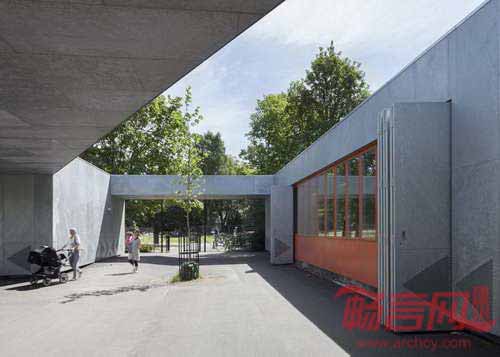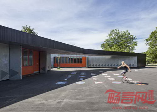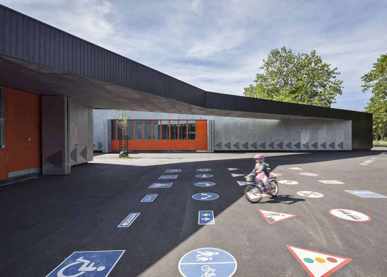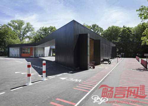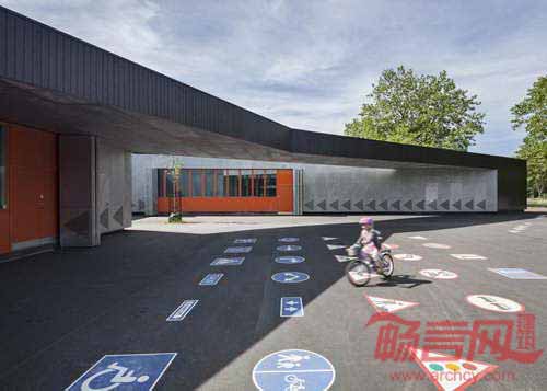 丹麦MLRP建筑事务所设计了位于哥本哈根的一座交通信号屋。该项目旨在教育儿童认识各种道路交通标志,现场通过检测,增强安全意识。交通屋设有教室和储存空间,在地面上添加了若干交通标志。该交通屋坐落于哥本哈根最大的停车场——Faelledparken。建筑设有折叠墙板,在白天开启,夜间关闭。折叠板材质分别是黑色木板和镀锌钢板,打开后可露出亮丽的橘色墙面,与冷色的建筑外墙构成鲜明反差。