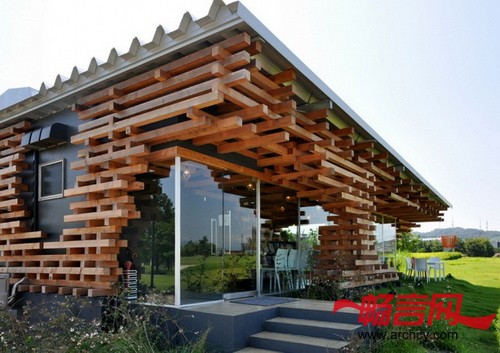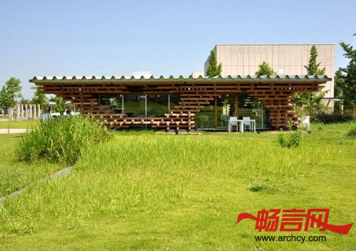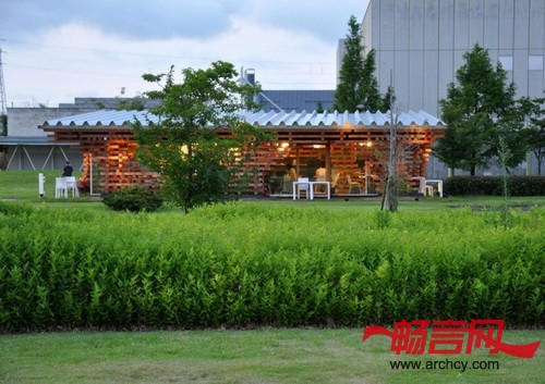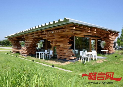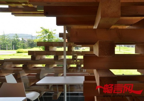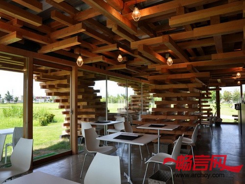 东京kengo kuma及合伙人建筑事务所最近在日本的富山完成了Kureon咖啡馆的设计。咖啡馆占地197平米,它的周围是一片草场围绕,因此,它尽可能少去占用地面。里面的餐厅是用玻璃围成的一个方形空间,外面用相互交叠的木板进行装饰。木板相互垂直,组成了一个网格状的结构。木板结构的长度从屋顶向下逐渐减少,直到地面上只有很小的几块与地基连接,让房子更加稳固。
