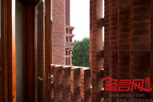 除了厚实的墙壁,房子外表的各个连接处也使用了红砖,赋予这座房子丰富的土陶色彩。阳光透过红砖制成的光栅,在房子正面和室内形成一个个格子状的光斑。