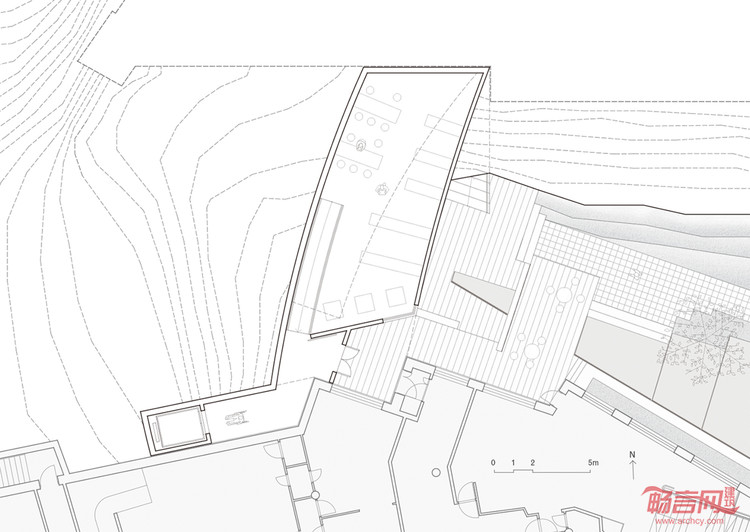 我们并没有将这个新的结构定义为一个建筑实体,而是一个人工的自然。通过一个开放的平台将自然引入。建筑的体量匍匐在等高线上,不是一个墙体,而是层层的退台链接成一个连续的公众流线。这个形态是对阿尔托的设计中几何的某种提取和转译,并延伸了博物馆原有的水池前导空间。观者通过水池,绕过树丛,拾级而上,蜿蜒绕转,最后到达的是一片浓茂的绿地:一个消隐的避世之所。