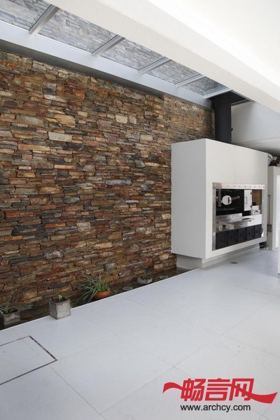 住宅的起居室、厨房和餐厅面向花园而建,自然光洒满了住宅的角角落落。它的空间布局打破了传统城市住宅的建造方式。石墙仿若是住宅里的指示牌,他指引着人们到达住宅的各个位置。靠近街道的石墙之地很粗糙,而建筑师巧夺天工的为它添加了一面流水墙,这样就让石墙看起来柔和多了。而人们的行程似乎也变得不那么乏味了,因为流水为每一处带来了不同的景观。
