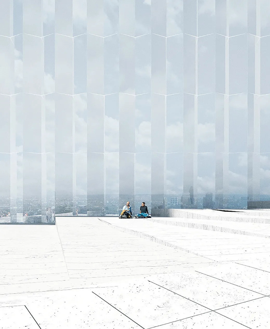 水平层往上,极富特色的V型塔楼直指天空。从不同角度看去,两栋塔楼的整体外观不断变化。塔楼的设计在策略上减少了落在公园和周边街区的阴影,同时为庭院创造了更好的光照条件。