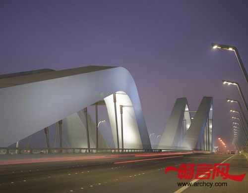 一个个的桥梁结构在海岸的一端开始,之后被抬起来,横跨在运河之上,形成了一个正弦曲线形的轮廓。