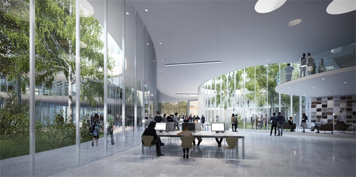 项目希望为该地区提供高标准校园建筑的同时,也能构建一个适宜公众休闲、交流的场所。开放的广场庭院,草坪景观和诸多树木环绕,利用公共建筑对城市发展的引擎作用,增强社会凝聚力,使工业区转变为一个具有活力的目的地。