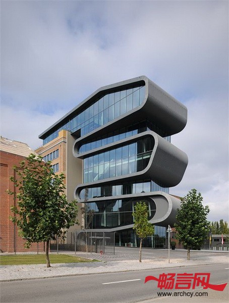 新办公楼非常亮眼,它将旁边的工业楼半包围住,成为了公司的新建筑标志。它也成为了场地中轴线上一个让人停留的空间。设计办公楼的时候,Conix把它旁边的道路缩窄了一些,并进行了对道路进行了设计,这样就为办公楼建造出了一条入口小路,而这正是以前没有的。与周围其它保留下来的、单调的建筑物相比,新办公楼的外形亮眼又奇特,它不但视觉上能吸引住人们的目光,从情感上也给人以舒适感。