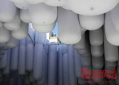 项目实际上并未添加任何材料,圆管的塑胶材质与帐篷材质吻合,设计师只是改变了材料呈现的方式,创造出高低错落的充气圆管。