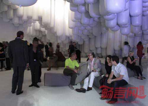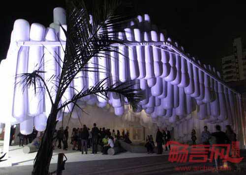 Snarkitecture工作室将迈阿密设计展帐篷覆盖了塑胶圆管,将圆管捆扎成不同的高度,在场地入口区形成了遮蔽空间。