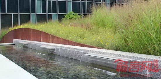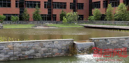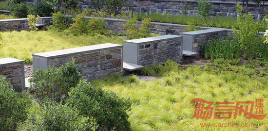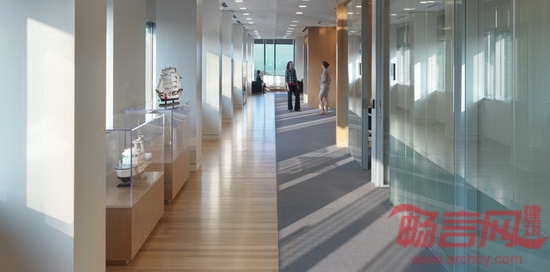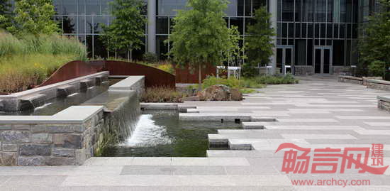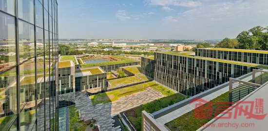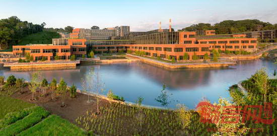 HOK为美国海岸警卫队总部大楼提供了景观设计和室内设计服务。项目位于华盛顿特区,大楼拥有美国第三大绿色屋顶,上方覆盖着面积达37,161平方米的绿植,帮助收集和贮存雨水,用以灌溉。庭院与大楼相互交错,沿着120英尺高的山丘向低处的园区铺展开来。项目基地的外部空间通过巧妙的景观设计将生态、美观、组织和教育等功能高效地整合在一起。这座高11层、建筑面积111,000平方米的大楼通过了LEED金级认证,并被美国国家工业与办公地产协会评为最佳可持续发展项目。