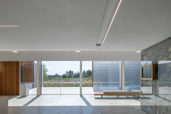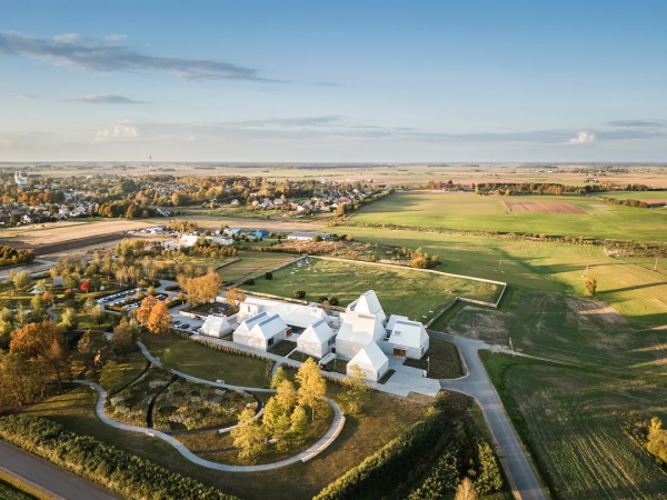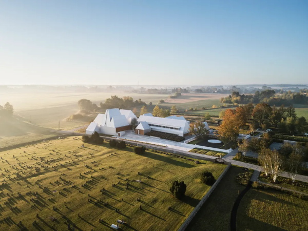 建筑由一组极简、抽象的四坡屋顶“房屋”体量构成,共同营造出如梦似幻的聚落景观,象征消失的犹太小镇。展厅上部呼应外部形态,屋脊天窗使自然光可控地进入室内,营造开阔感;下部空间则以展览的集中性为特征。一层展厅通过精心设置的开口引入外部景观,可望见历史墓地。立面采用海洋级铝材,以类似木瓦的形式排列,形成鳞片状表面,随光线与季节呈现白、银灰之间的变化,呼应立陶宛乡村中风化的农舍。承重结构为现场浇筑混凝土,技术设备尽可能隐藏于视线之外。